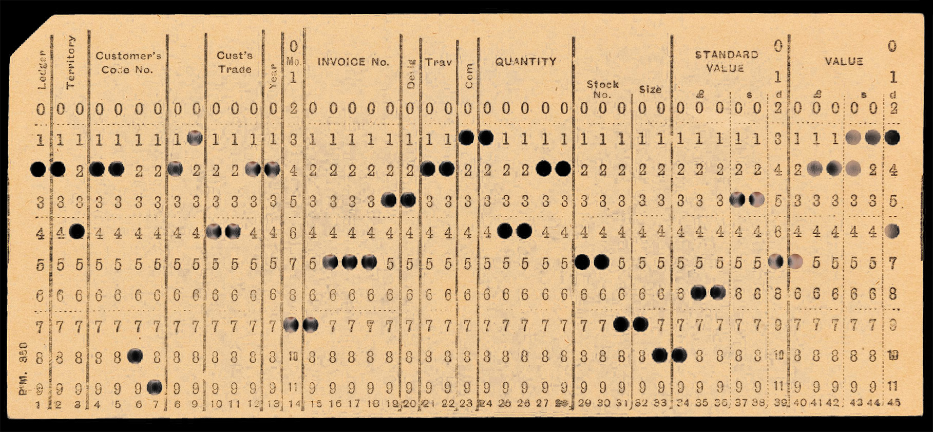 Punch card for 'Powers' Mechanical accounting machine, c.1955.